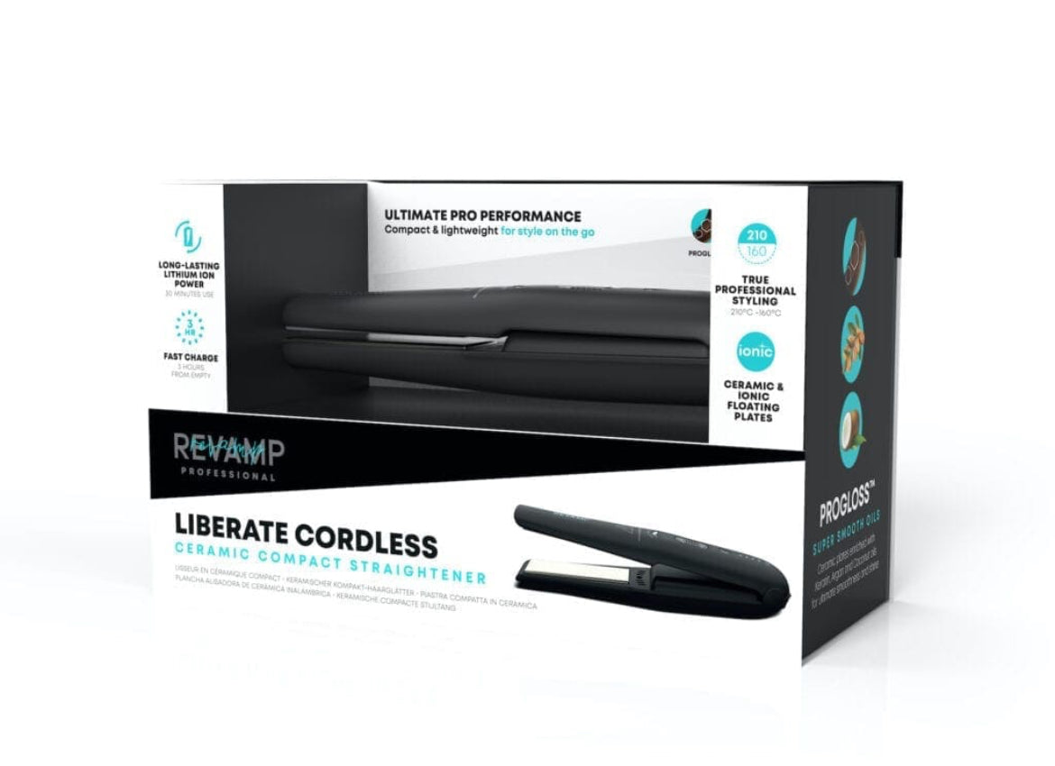 La piastra cordless in ceramica Revamp Progloss Liberate Compact è lo strumento perfetto per sistemare i capelli durante gli spostamenti, quando sei in vacanza o per un weekend fuori porta. Uno styling senza fili, con 3 impostazioni di temperatura che vanno da 160°C a 210°C, la chiusura da viaggio incorporata e custodia resistente al calore; la piastra Progloss Liberate Compact offre fino a 30 minuti di utilizzo (con 3 ore di ricarica rapida).